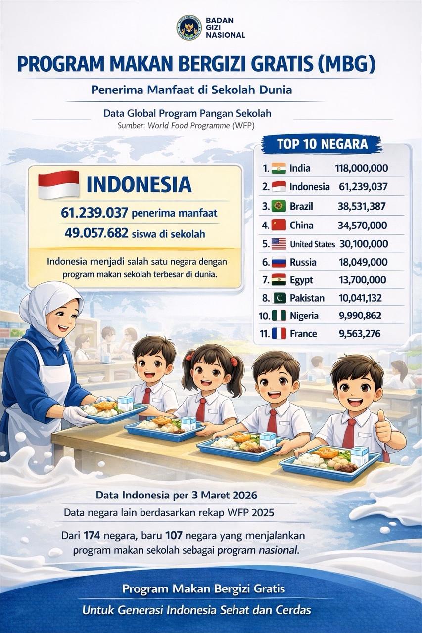 Data global tersebut menunjukkan bahwa dari 174 negara di dunia, baru 107 negara yang menjalankan program makan sekolah sebagai program nasional. Fakta ini menegaskan bahwa Indonesia termasuk dalam kelompok negara yang secara serius menjadikan pemenuhan gizi anak sebagai prioritas pembangunan.
