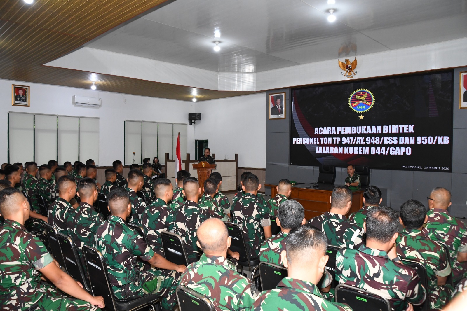 Intimate.co.id | Palembang – Komando Resor Militer 044/Garuda Dempo menggelar kegiatan pembukaan Bimbingan Teknis bagi personel staf Batalyon TP jajaran Korem 044/Gapo. Kegiatan ini secara resmi dibuka langsung oleh Komandan Korem 044/Gapo, Brigjen TNI Khabib Mahfud, Senin (30/3/2026).