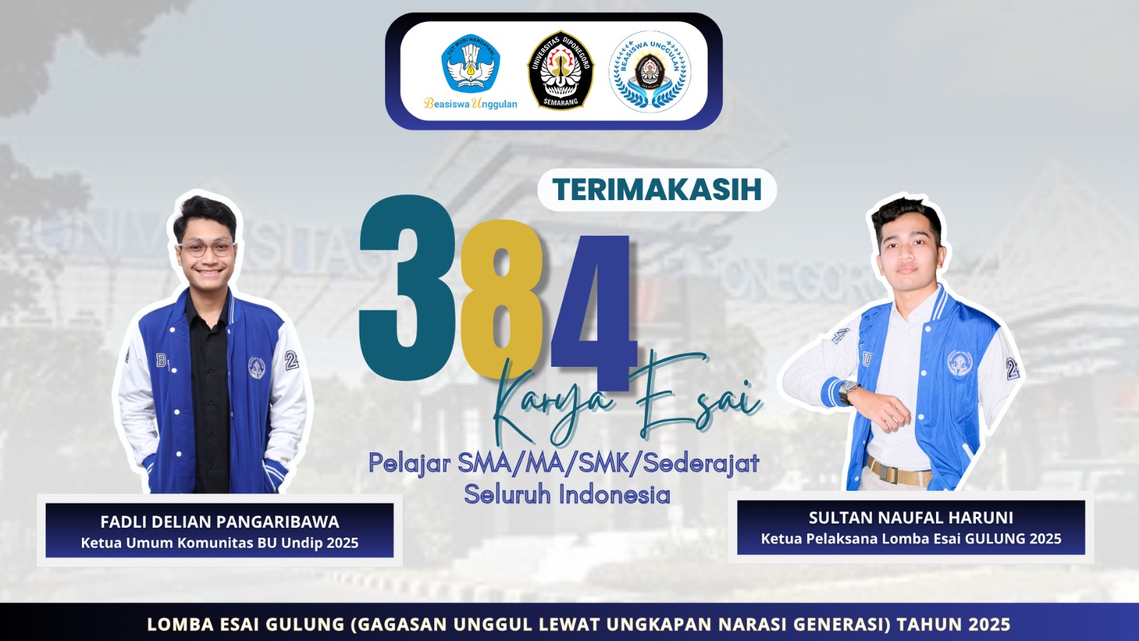 Intimate.co.id |Semarang (7 November 2025) – Komunitas Beasiswa Unggulan Universitas Diponegoro (BU Undip) telah sukses menyelenggarakan kegiatan Lomba Esai GULUNG (Gagasan Unggul Lewat Ungkapan Narasi Generasi) Tahun 2025 yang diikuti oleh ratusan pelajar SMA/MA/SMK/sederajat dari seluruh Indonesia.